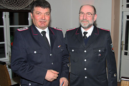 Über die Beförderung seines Stellvertreters Kai Dethlefsen zum Hauptlöschmeister mit drei Sternen freute sich Ortsfeuerwehrführer Tieze besonders und dankte dem stellvertretenden Amtswehrführer Klaus-Peter Ottens, dass dieser die Ehrung an ihn abgetreten hat.