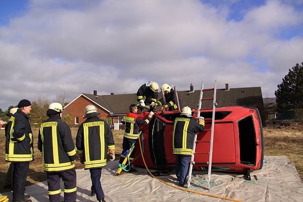 Federführend hatte die FF Nebel (Jens Lucke und Gerd Tieze) in enger Zusammenarbeit mit dem Kreisfeuerwehrverband Nordfriesland nun einen Lehrgang auf Amrum organisiert. 20 Kameraden der Amrumer Feuerwehren haben an diesem Wochenende das Angebot genutzt. Vom Kreisfeuerwehrverband kamen Brandmeister Roland Strauss (Fachbereichsleiter für die Ausbildung Technische Hilfeleistung / Kreisausbilder TH) und Oberbrandmeister Klaus-Dieter Dorow (Fachbereichsleiter für die Ausbildung Atemschutz / Maschinist / Sprechfunk / Kreisausbilder TH) auf die Insel. Nach mehreren Abenden Theorie folgten den ganzen Samstag praktische Einweisungen und Übungen. Die theoretisch erworbenen Neuerungen konnten ebenso ausprobiert und getestet werden wie verschiedene vom Kreisfeuerwehrverband mitgebrachte Geräte und Hilfsmittel.